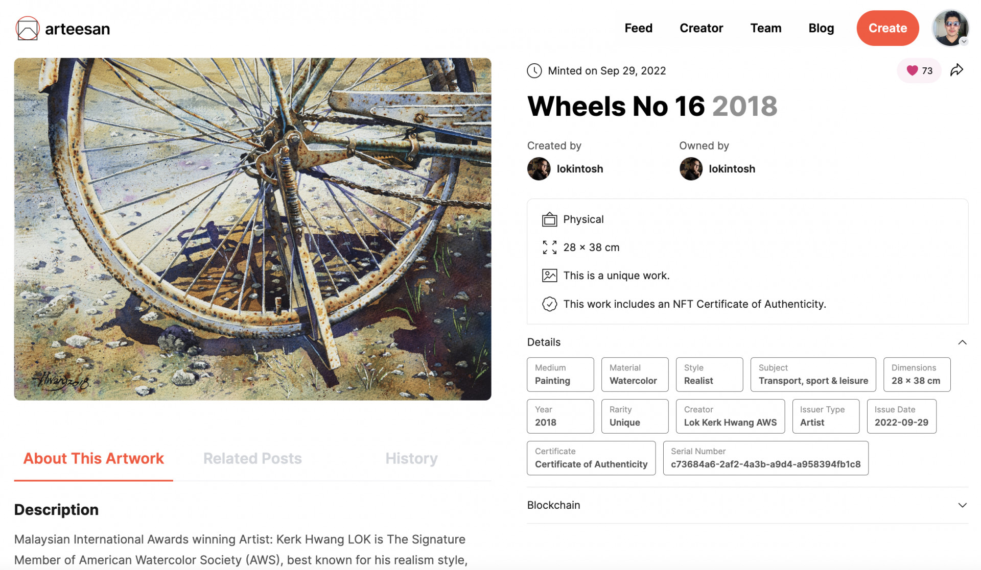 Creating (also known as minting) an NFT especially one that serves as a certificate of authenticity can be daunting. You will have to learn about blockchain wallets, buying cryptocurrency and funding your wallet, and signing blockchain transactions. Arteesan provides a free and easy-to-use tool for artists to create the NFT-COA, all you need to do is to have a creator account with Arteesan.